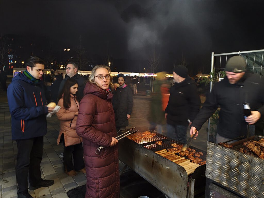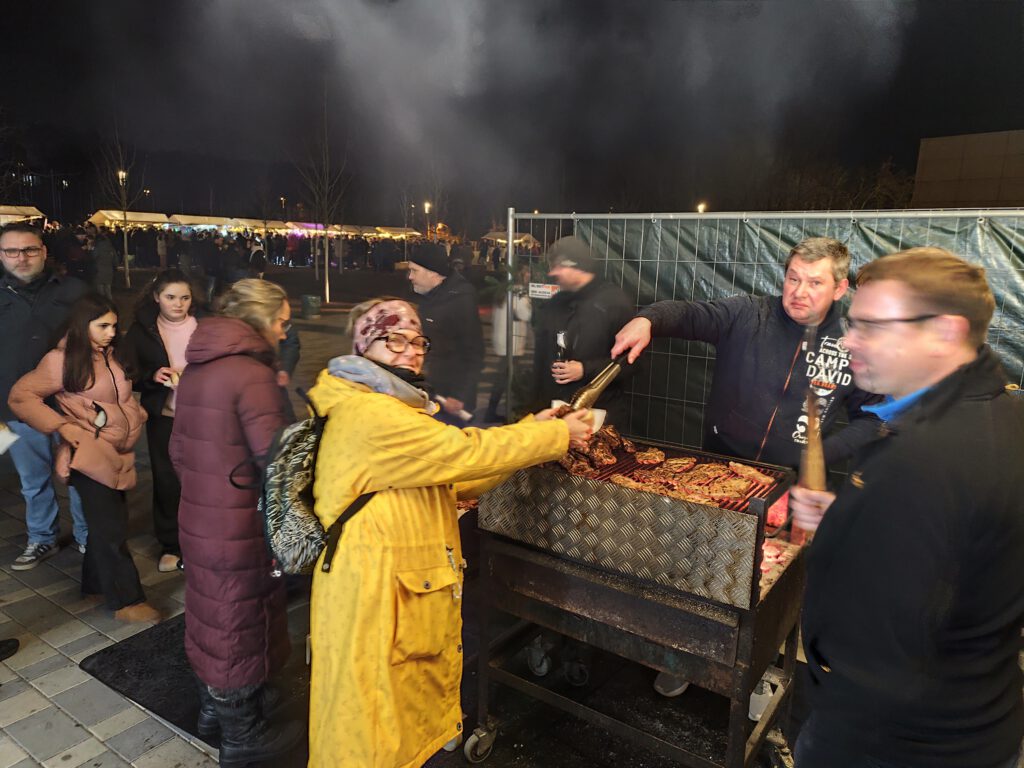 Letztlich konnten wir unser komplettes Fleisch und alle Würste an den Mann und die Frau bringen. Und das, obwohl zwischenzeitlich ein Regengebiet son manchen Tropfen fallen ließ. Ganz zu schweigen davon, dass bereits am späten Vormittag einige Windböen einen Teil der Stände arg in Mittleidenschaft gezogen hatte und unklar war, ob der Weihnachtsmarkt überhaupt in der hewohnten Weisen stattfinden kann.