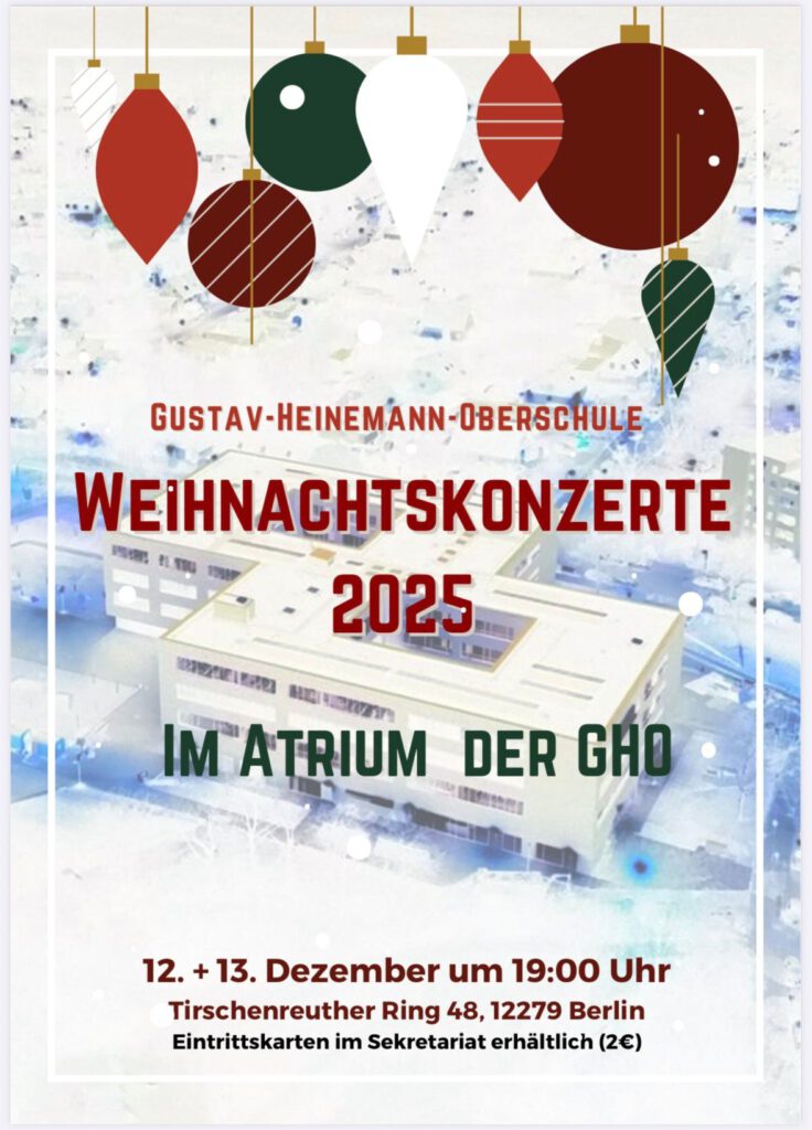 Am 12. und 13. Dezember 2025 finden jeweils um 19:00 Uhr die traditionellen Weihnachtskonzerte in der Forumshalle der GHO statt. Die Bläserklassen, Bands und Orchester spielen an beiden Terminen ein identisches Programm, um Familien und Freunde auf musikalische Art auf die Weihnachtszeit einzutimmen.